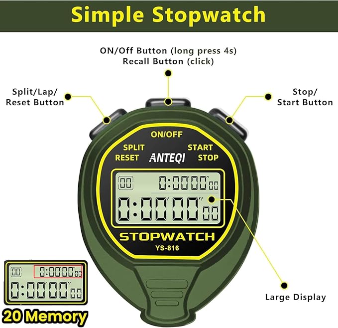- Upgraded Simple Stopwatch: We've made some upgrades to the Simple Stopwatch! A new 20-lap split measurement function is added; while the ON/Off function is retained to save power and extend the service life of the stopwatch. Only stopwatch function, without clock calendar alarm, easy to set up and use
