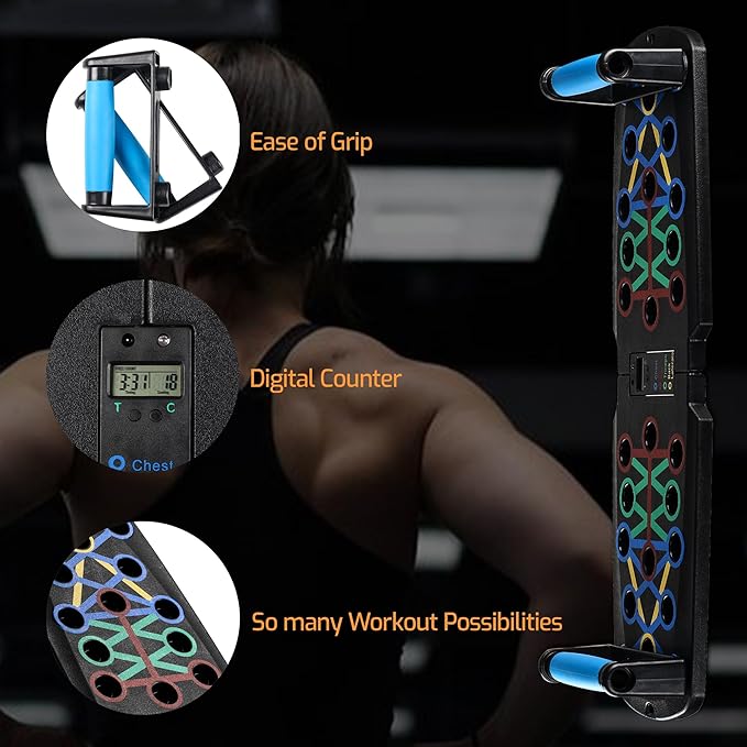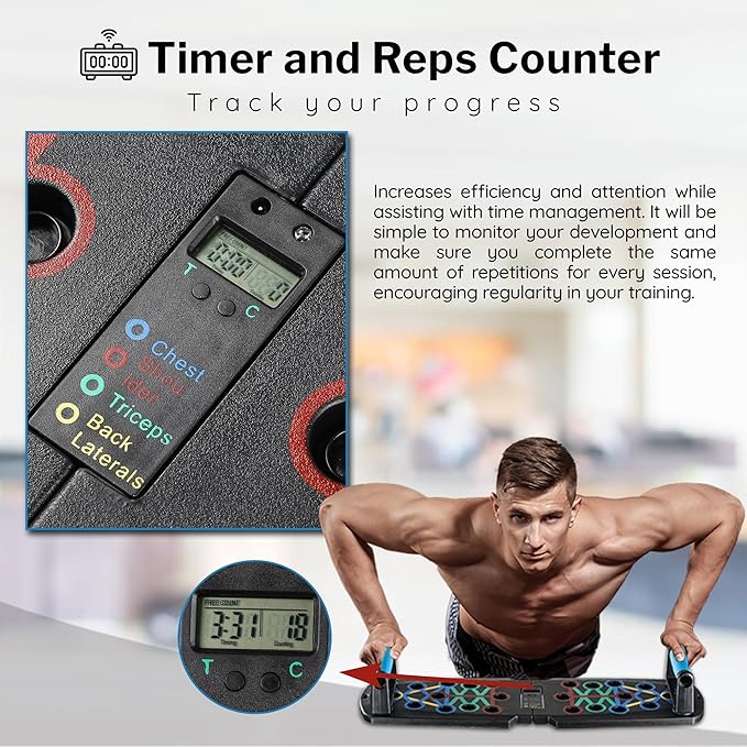 - [SMART COUNTER]: Our push up machine features an intelligent battery operated counter with several functions, allowing you to keep an accurate track of your reps and time to help you constantly challenge your system for maximum fat burning. Let you liberate your brain, exercise scientifically and effectively, and no longer have to worry about misremembering numbers.. The digital timer requires 2 x AAA batteries, not included.