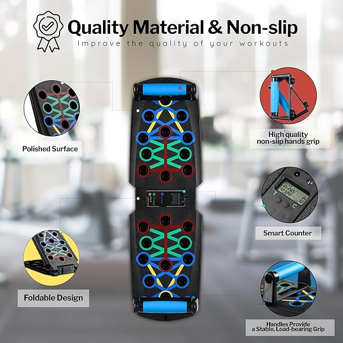 - [FULL BODY WORKOUT]: The color coded training system of these strength training pushup stands allow you to target the desired muscle groups according to your customized needs, being ideal for toning, strengthening your upper body, correcting posture and more. Easily train your chest, biceps, triceps and back with this 22 in 1 push up board!