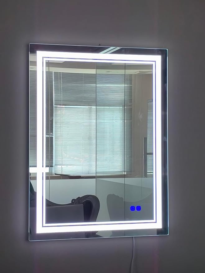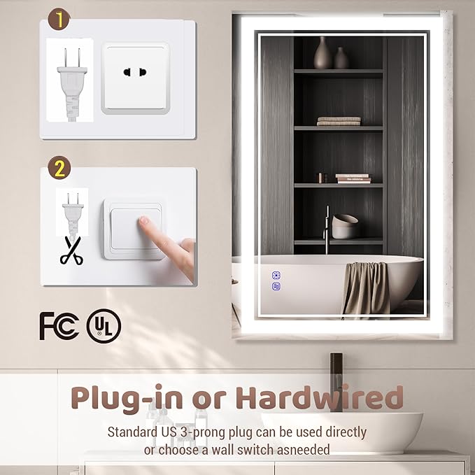 - PLUG IN OR WALL SWITCH: With a standard US 3-prong plug, you can plug directly into an outlet to use this large lighted bathroom mirror 32'' x 24'', or hardwire it to control it via a wall switch. You can install it directly in the bathroom or bedroom.