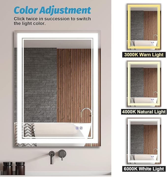 - DIMMABLE & 3 COLOR TEMPERATURE: bath mirror has a built-in high-quality led light strip, which can switch the color temperature of 3000-6000K. You can adjust the light brightness of the bathroom mirror according to your shaver own needs.
