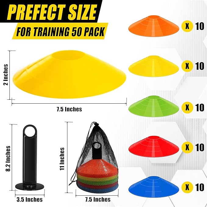 - 【VALUE PACKAGE】Our cones for sports training include 50 soccer cones (5 colors, 10 of each color), 1 cone holder, and 1 carry bag. Whether you are an amateur or professional athlete, our sports cones can meet your needs for daily agility training and outdoor sports training.