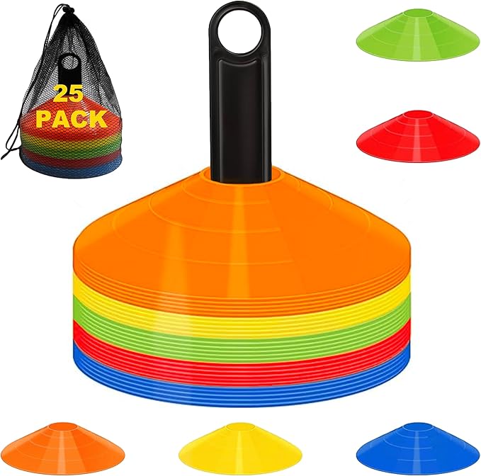 - 【VALUE PACKAGE】Our cones for sports training include 25 soccer cones (5 colors, 5 of each color), 1 cone holder, and 1 carry bag. Whether you are an amateur or professional athlete, our sports cones can meet your needs for daily agility training and outdoor sports training.