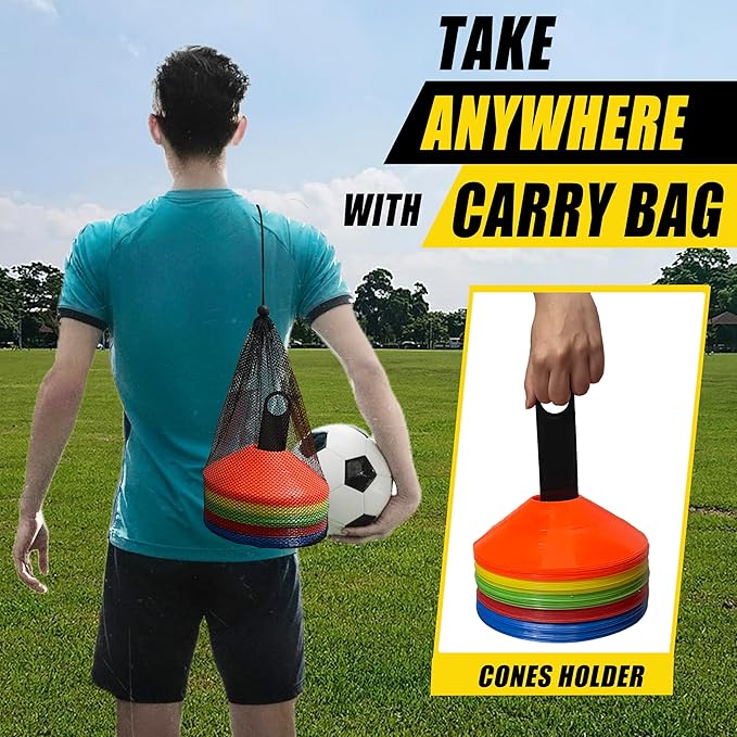 - 【EASY TO USE & CARRY】This soccer training equipment is lightweight and comes with a carring bag and cones holder, so you can easily carry them for practice while keeping them neat and organized. Coaches, trainers, and athletes can easily arrange cones as needed, and can be used for sidelines, boundary markings, speed agility training, basketball, obstacles, goals, and many other training activities.
