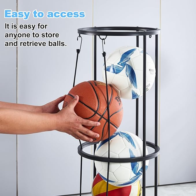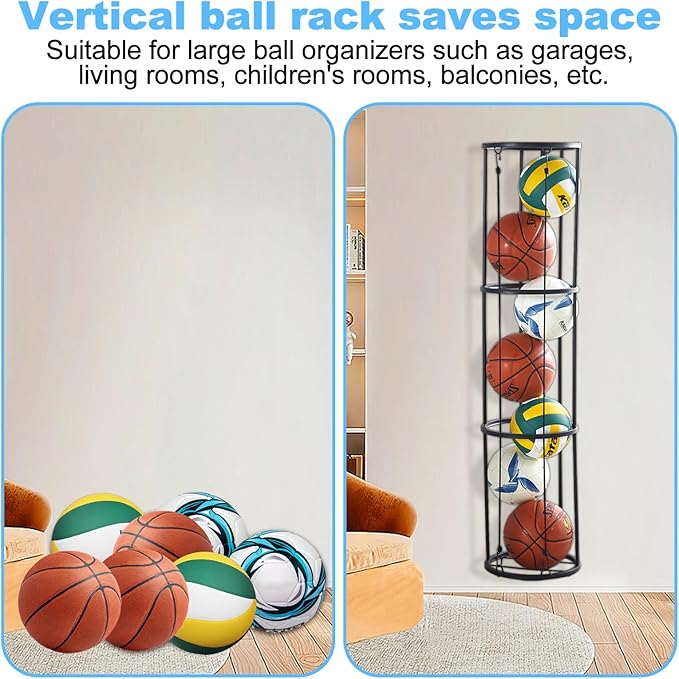 - 【Space-Saving Design】Equipped with 2 bungee cords, the Basketball Storage Rack allows for easy access. The Ball Holder can either be placed on the ground or mounted on a wall, helping you maximize space in your garage or home.