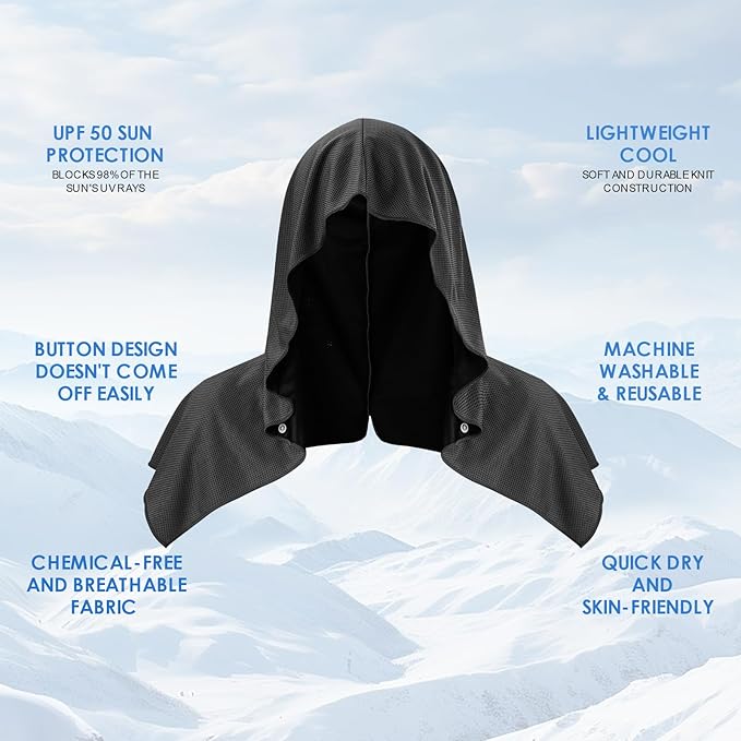 - 【QUALITY MATERIAL】:Cooling hoodie towel is made of high-quality microfibers with a mesh pattern, is breathable, UV protection, lightweight soft, durable and easy to fold. Not only skin-friendly for the neck and face or other body areas, it's also chemical-free and safety for all users. The special structural design allows it to maintain cooling and dissipate heat in summer.