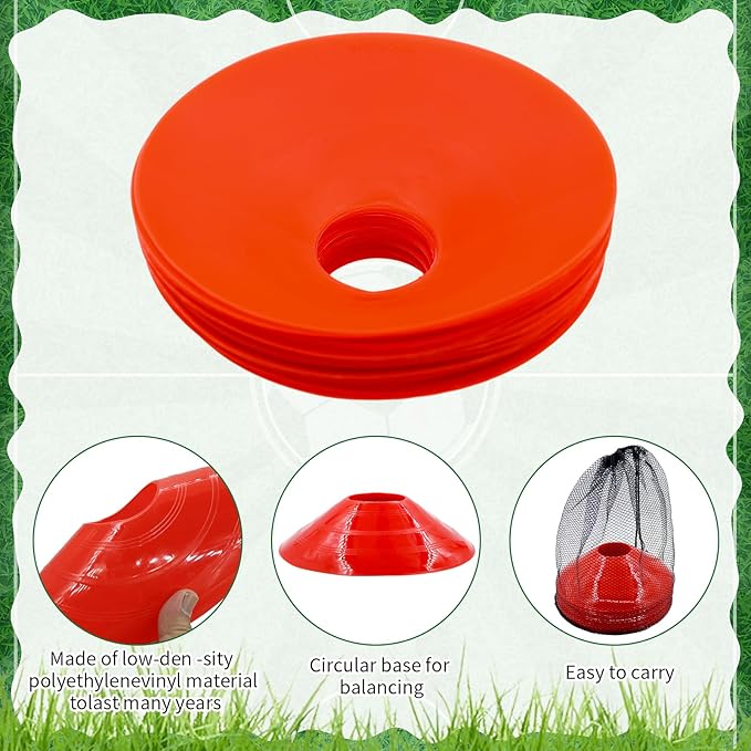 - Thickened material: Color disc cones made of PE material, each training cones quality is both sturdy and durable, and the quality is better than the ordinary disc cones. They don't lose shape from being stepped on unlike other low quality sets.
