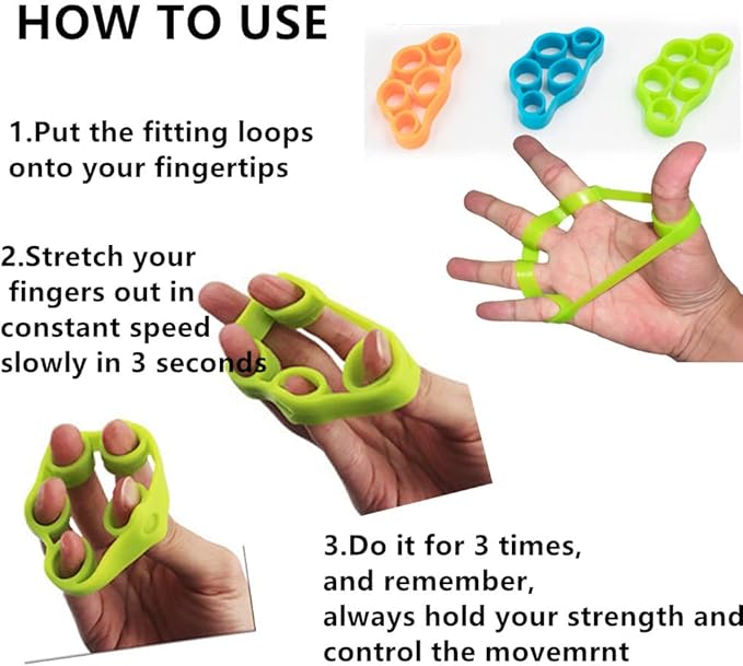 - High Quality: The three-piece finger exercise set is constructed with a premium silicone that is odorless and latex-free, it will not damage your hands and fingers. They are safe, washable and not easy to tear. Their strong design enable you to use them continuously without restraint and Enjoy its long lasting benefits.