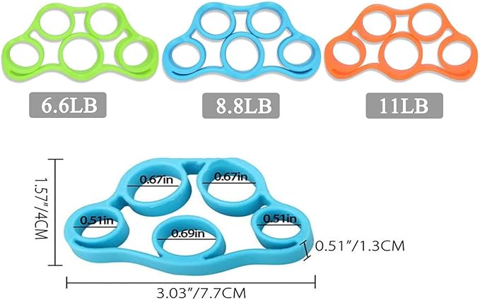 - 3 Level Resistance: This Kit includes 3pcs finger strengthener, you can train your finger according to your needs (Green-6.6lbs, Blue-8.8lbs, Orange-11lbs). Different resistances let you periodize the traning and help to increase grip strength and better forearm development. The total finger strengthening workouts for all fitness levels, help balance your grip muscles and expanding muscles from beginner to advanced!