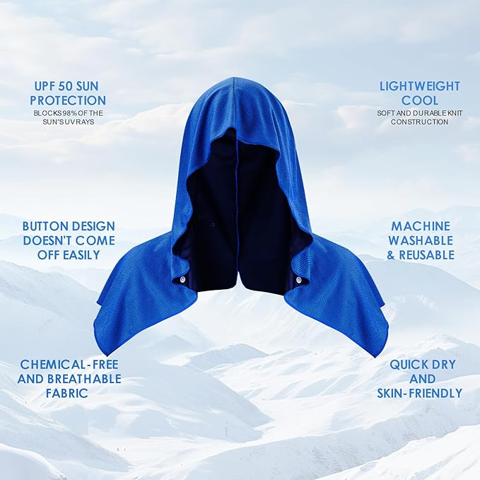 - 【QUALITY MATERIAL】:Cooling hoodie towel is made of high-quality microfibers with a mesh pattern, is breathable, UV protection, lightweight soft, durable and easy to fold. Not only skin-friendly for the neck and face or other body areas, it's also chemical-free and safety for all users. The special structural design allows it to maintain cooling and dissipate heat in summer.