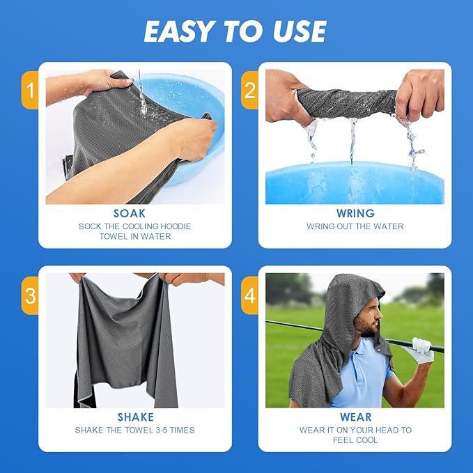 - 【MULTIFUNCTION】:This cooling hoodie towel is perfect for exercise enthusiasts who love yoga, sports, swimming, exercise, gym, golf, camping and fitness. It is also ideal for outdoor workers who work in hot weather. Using a cooling hoodie towel for your neck and face will help you avoid sunburn or heat stroke and bring you a refreshing. You can also use it to relieve the headache caused by fever, and the physical cooling of burns. It's a great summer accessories for any activities.