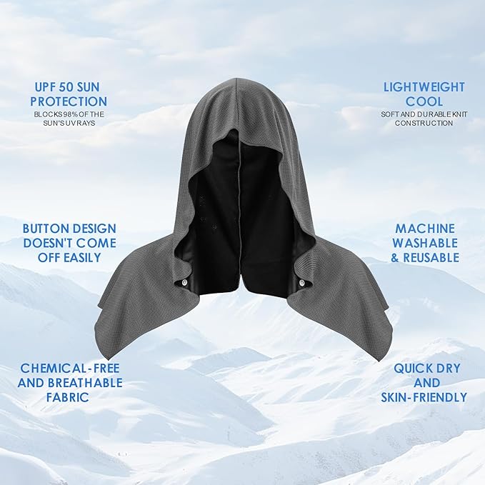 - 【QUALITY MATERIAL】:Cooling hoodie towel is made of high-quality microfibers with a mesh pattern, is breathable, UV protection, lightweight soft, durable and easy to fold. Not only skin-friendly for the neck and face or other body areas, it's also chemical-free and safety for all users. The special structural design allows it to maintain cooling and dissipate heat in summer.