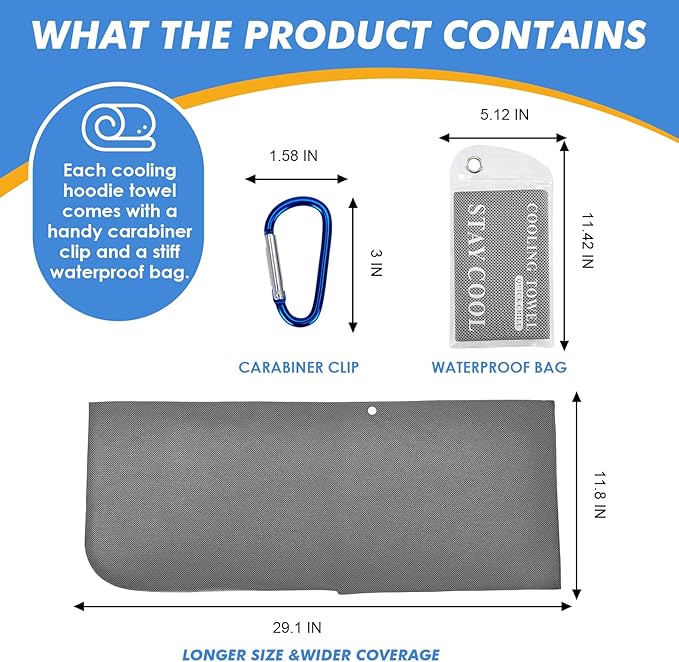 - 【DESIGN FEATURES】: Measuring "29x12", the cooling hoodie towel offers ample coverage for your neck and face and other body areas. Expanding the size brings better cooling effects. Crafted from high-quality materials, these towels are durable and longevity, providing a dependable, cost-effective cooling solution for the long term. Feel free to contact us for any issues.