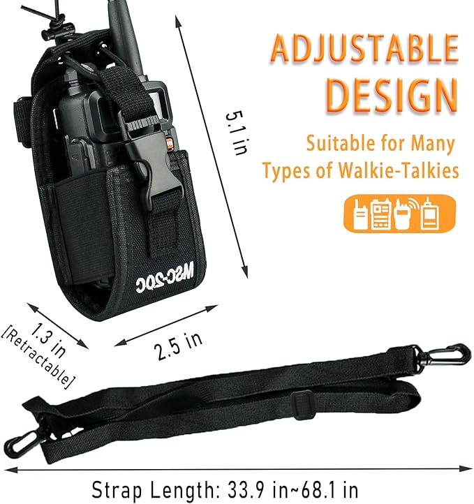- High quality: Radio holder constructed by high quality and durable nylon material, elasticated cord secures the top of the walkie talkie and adjusts the pouch size to fit. elastic side webbing designed to hold different sized radios in place. 1” webbing sho