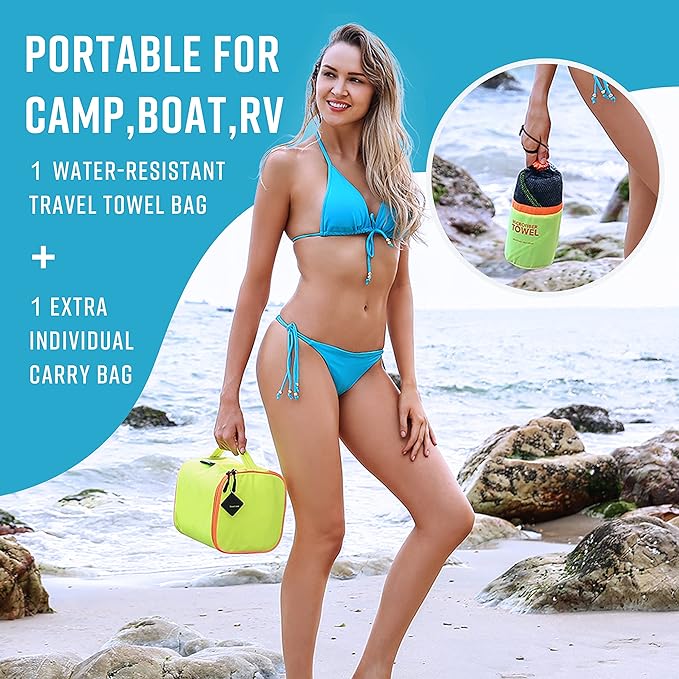 - 【Special Designed Family Pack】Awesome water resistant bag includes 4 towel and 1 extra mesh bag,a perfect choice for a family of four if you want to go camping or the beaches.Each towel has a special color seam that allows family members to track their own towels.