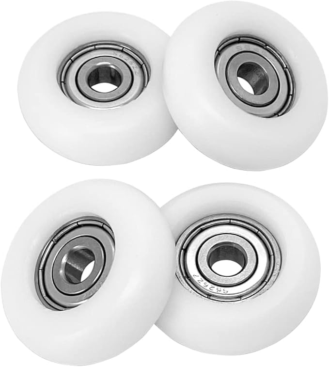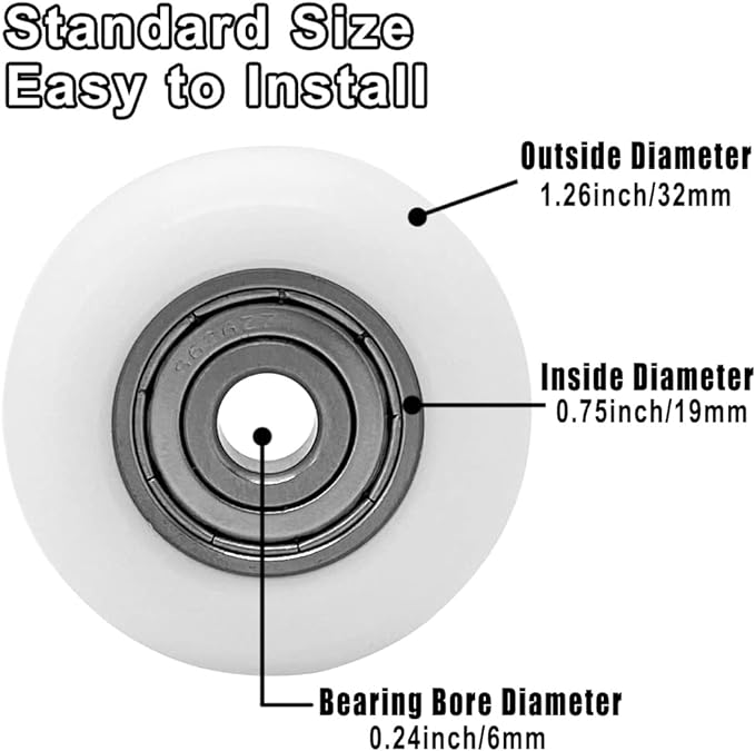 - Size: The bearings have a through-hole diameter of approximately 1/4"(M6). The outer diameter and the inner diameter of the wheel (Plastic part) are 1.25" and 0.75". PLEASE check whether the product size meets your needs before buying.