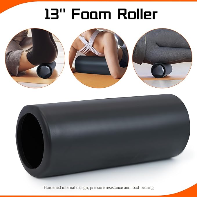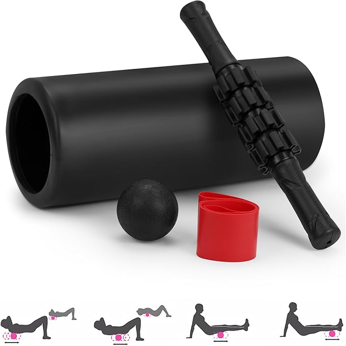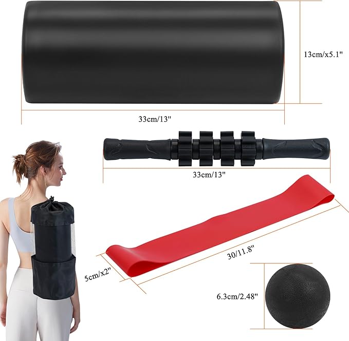 - 【Foam Roller Set】Package includes 1* hollow foam roller(13"*5"), 1* Muscle Roller Stick(13"), 1* massage ball(Φ2.5"), 1* stretching band(24"*2"), 1 storage bag.