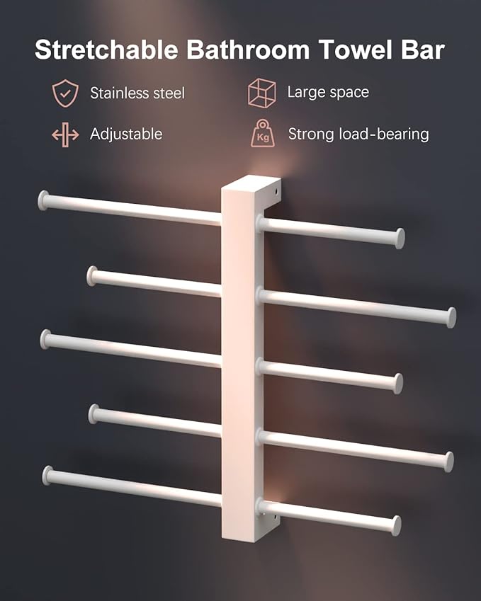 - Sizes and Material: Bridge sliding 5-Tier bath towel bar stretching on both sides can reach 15 Inch to 30 Inch, 1.5 inch/3.8cm tube diameter, screws length 2.4"/ 6cm, you can install it in any length if you wish. Constructed of premium thicken, ANTI-RUST solid and durable stainless steel. Perfectly smooth oil rubbed white finish is built to resist daily scratches, corrosions, and tarnishing.