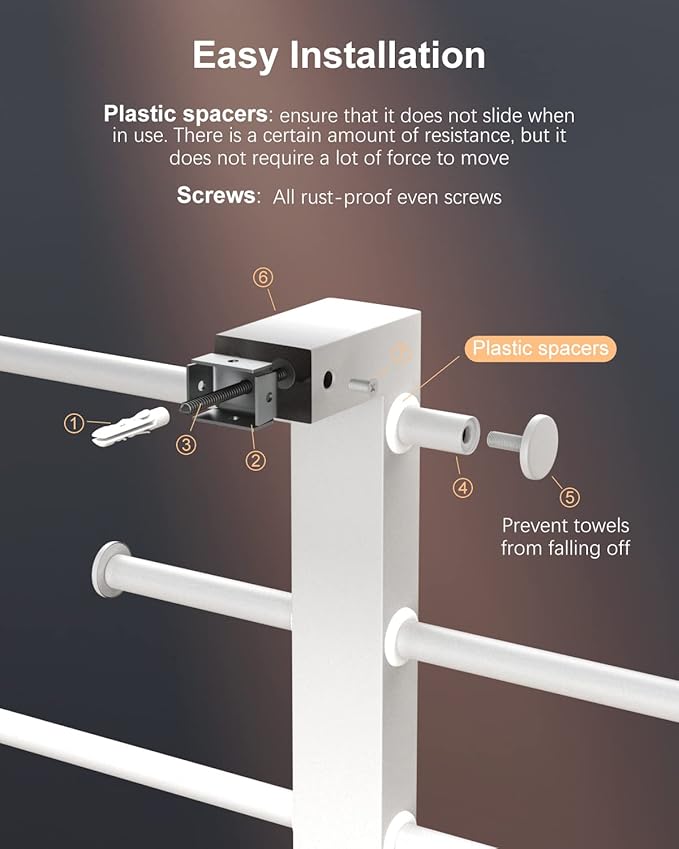 - Package: 1pcs 5-Tier Bridge sliding adjustable towel bar with 6 sliding hooks and installation instructions. In case screws are lost/damaged during installation, ZUEXT towel rack has one pack of screws specially prepared for you.