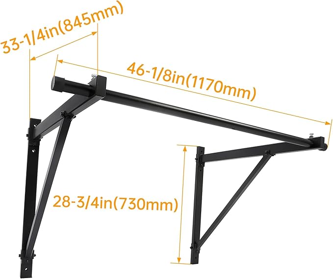 • Bracket Height: 28-3/4 inch, Bracket Depth: 33-1/4 inch, Bar length: 46-1/8 inch,Bar diameter: 1-1/4 inch. You can use our heavy duty Pull Up Bar to dress your home as a gym, and you can exercise freely even at home. It can be installed vertically or horizontally, and the height can be installed according to your needs.