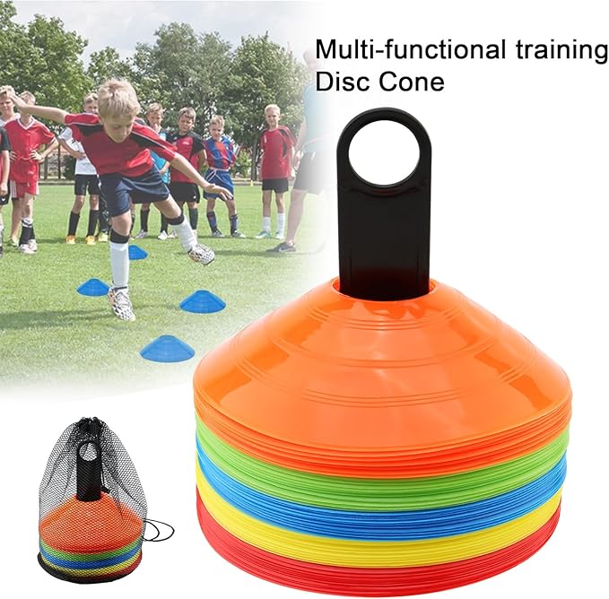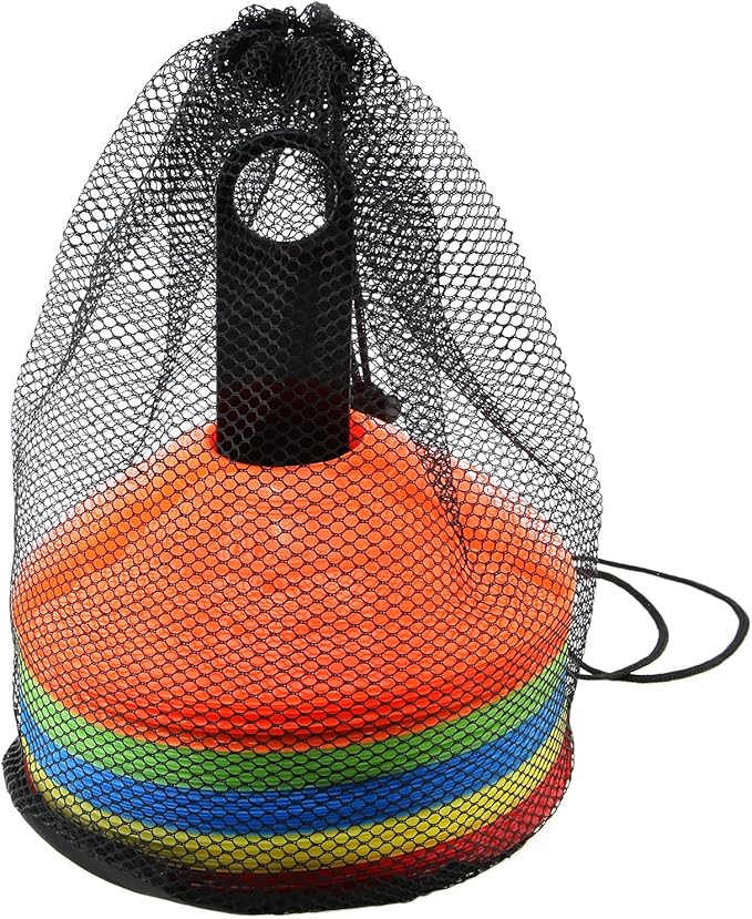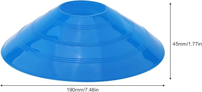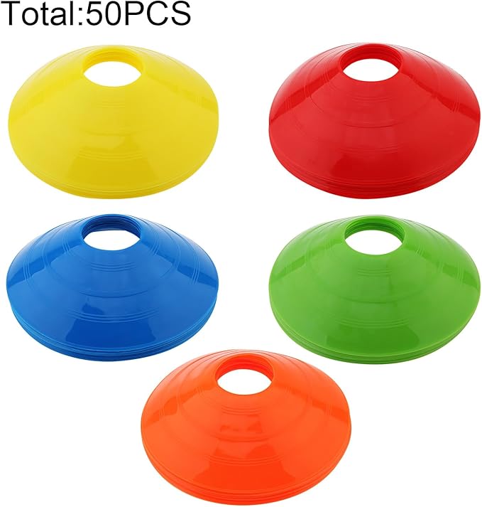 - Measurements: Soccer cones are 2" height x 7.8" diameter. includ 50 pcs cones (5 colors: blue ,orange, yellow, red, and green),1 * mesh carrying bag, 1 * plastic holder.