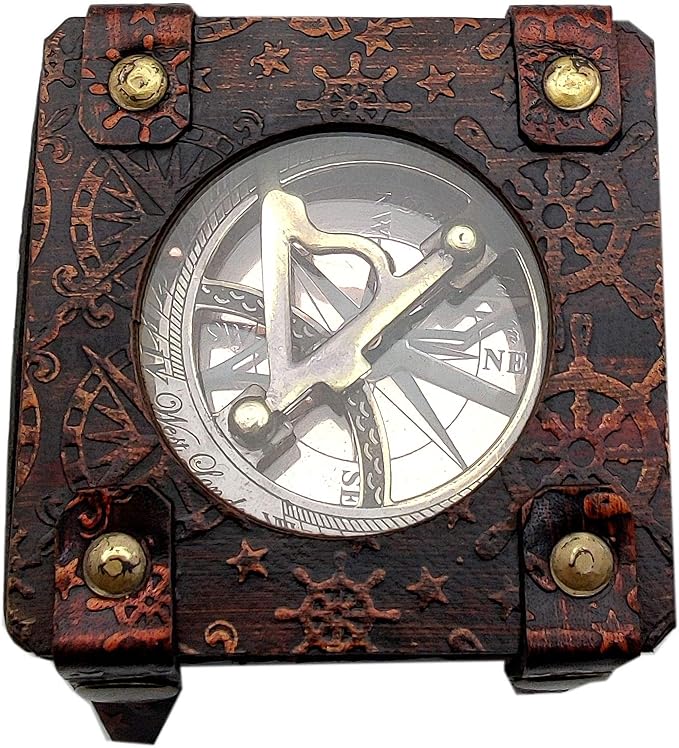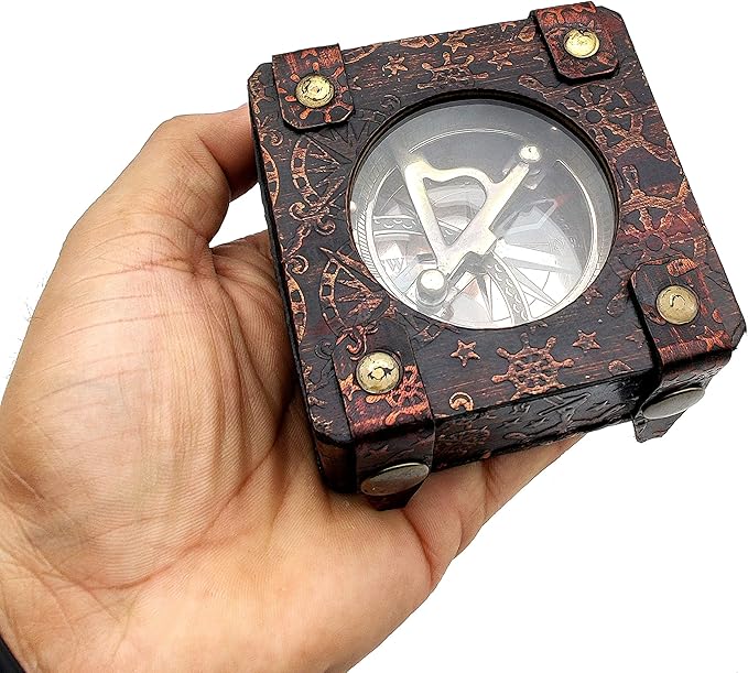 - WORKING NAVIGATION INSTRUMENT : Antique Design Made Of Antique Look Solid Brass with Leather glass lid display box. A recreation brass sundial compass that have guided the sailor in dream direction since long ago. this compass is 2.7 wide