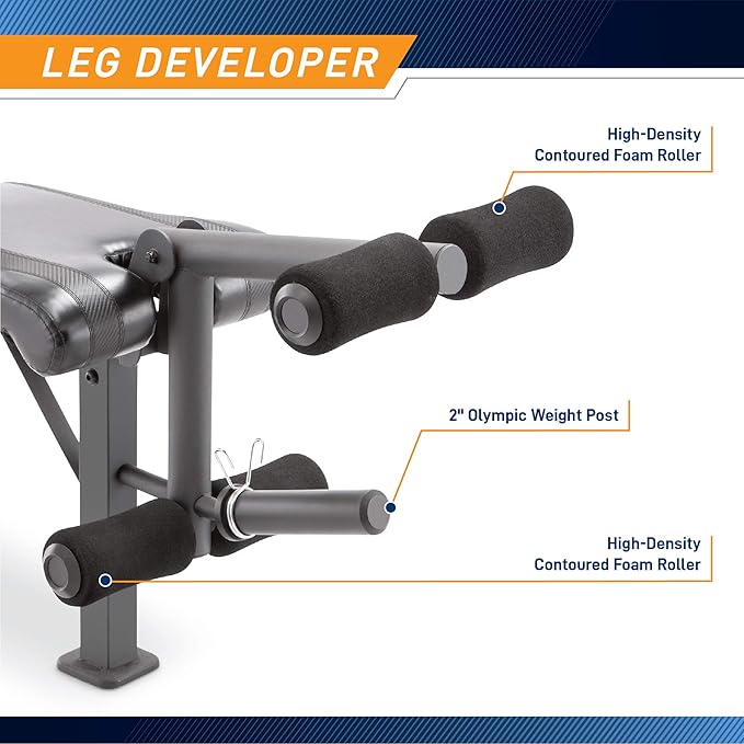 - DUAL-FUNCTION LEG DEVELOPER – This bench has a dual-action leg developer to boost your lower body. It also comes with padded foam rollers for maximum comfort on your ankles and knees.