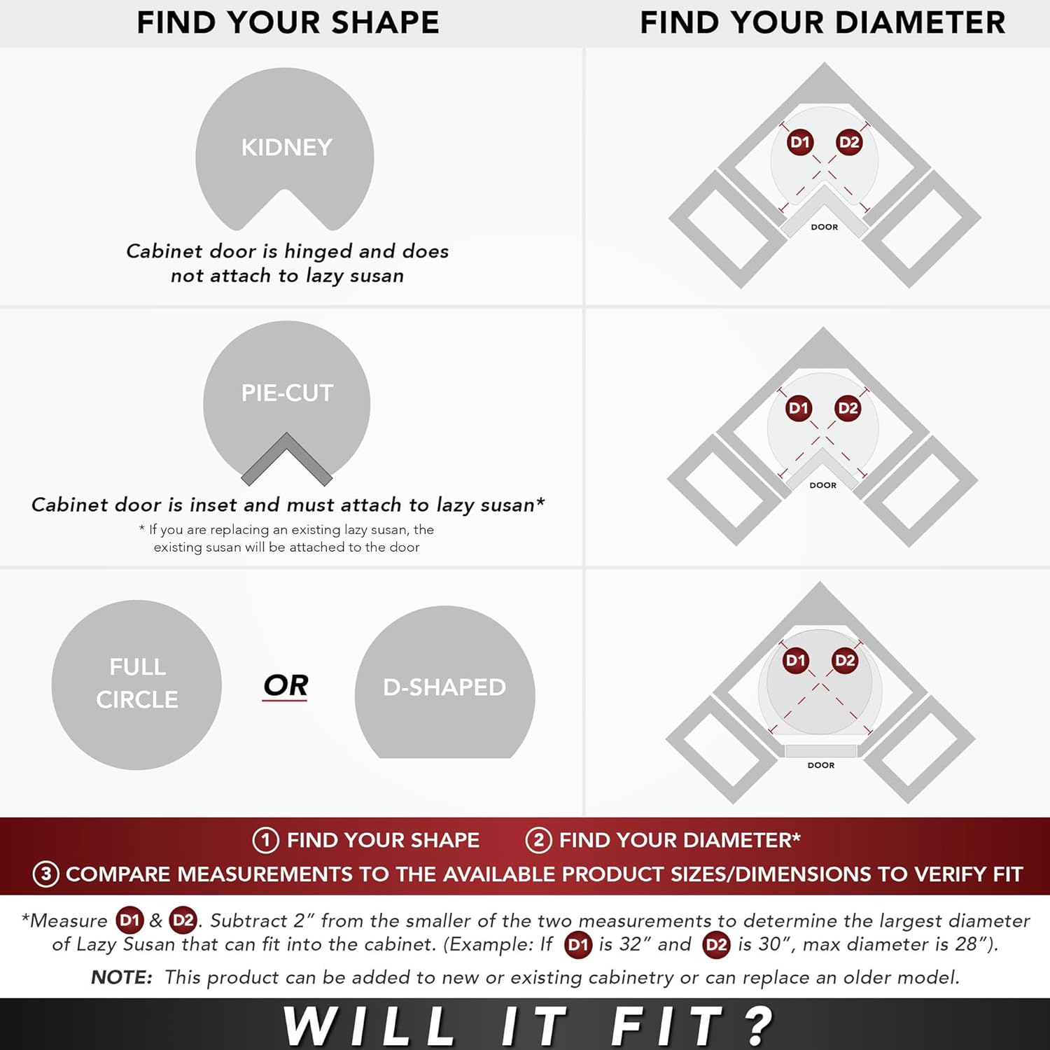 - Disclaimer: All 2 and 3-shelf Lazy Susans for Wall or Base corner cabinets must first be assembled inside of the cabinet, before final installation; Kidney Lazy Susans only work with corner cabinets when the door is hinged and will not attach to any type of door