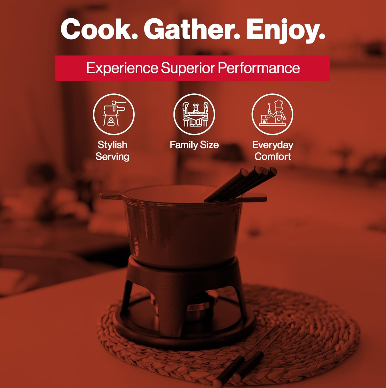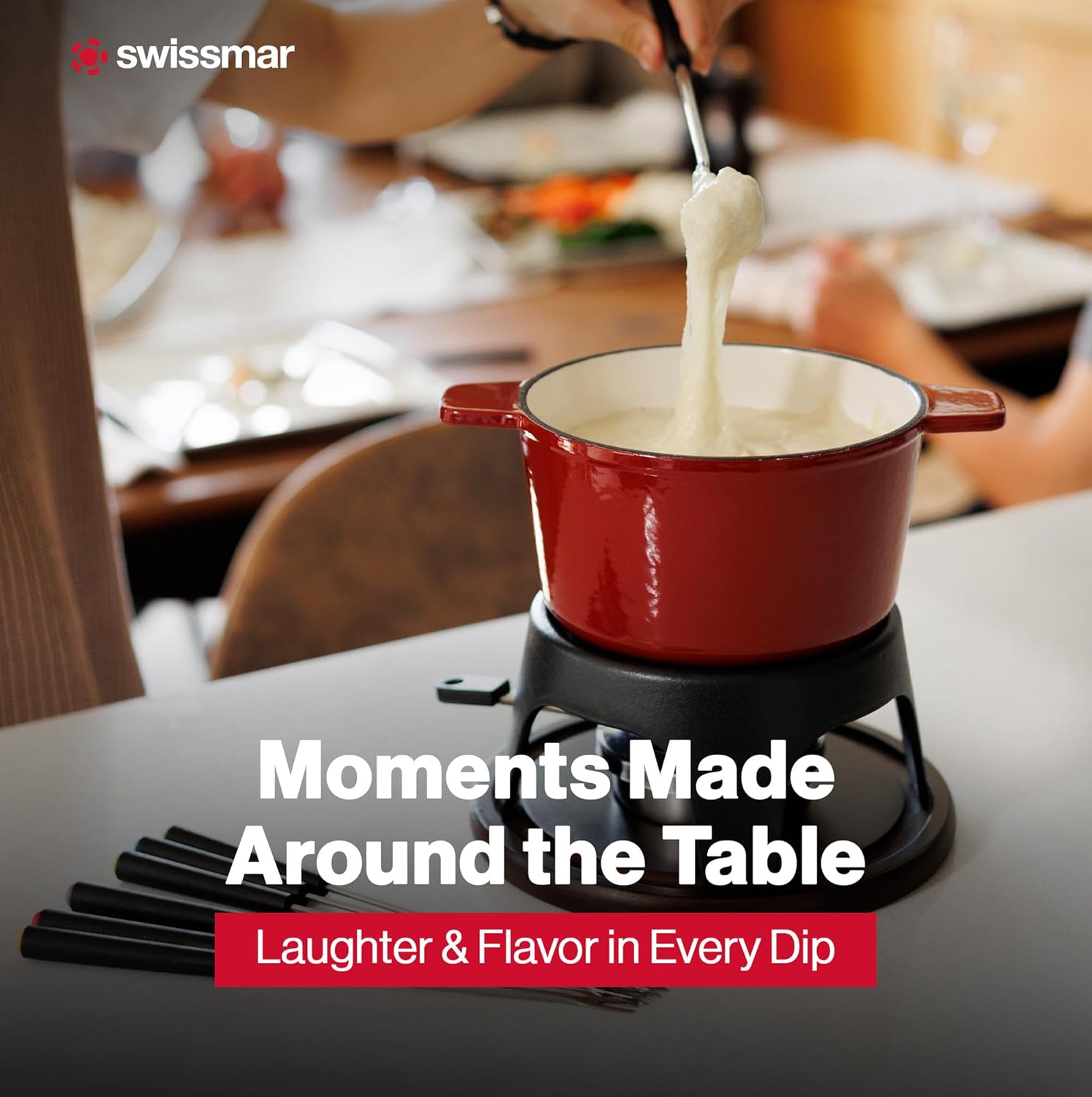Swissmar Sierra Cast Iron Fondue Set, 1.6 Quart / 1.6 Liter – Perfect for Meat, Cheese, & Chocolate Fondues – Ideal for Family Bonding & Hosting Gifts - 12-Pieces, Cherry Red