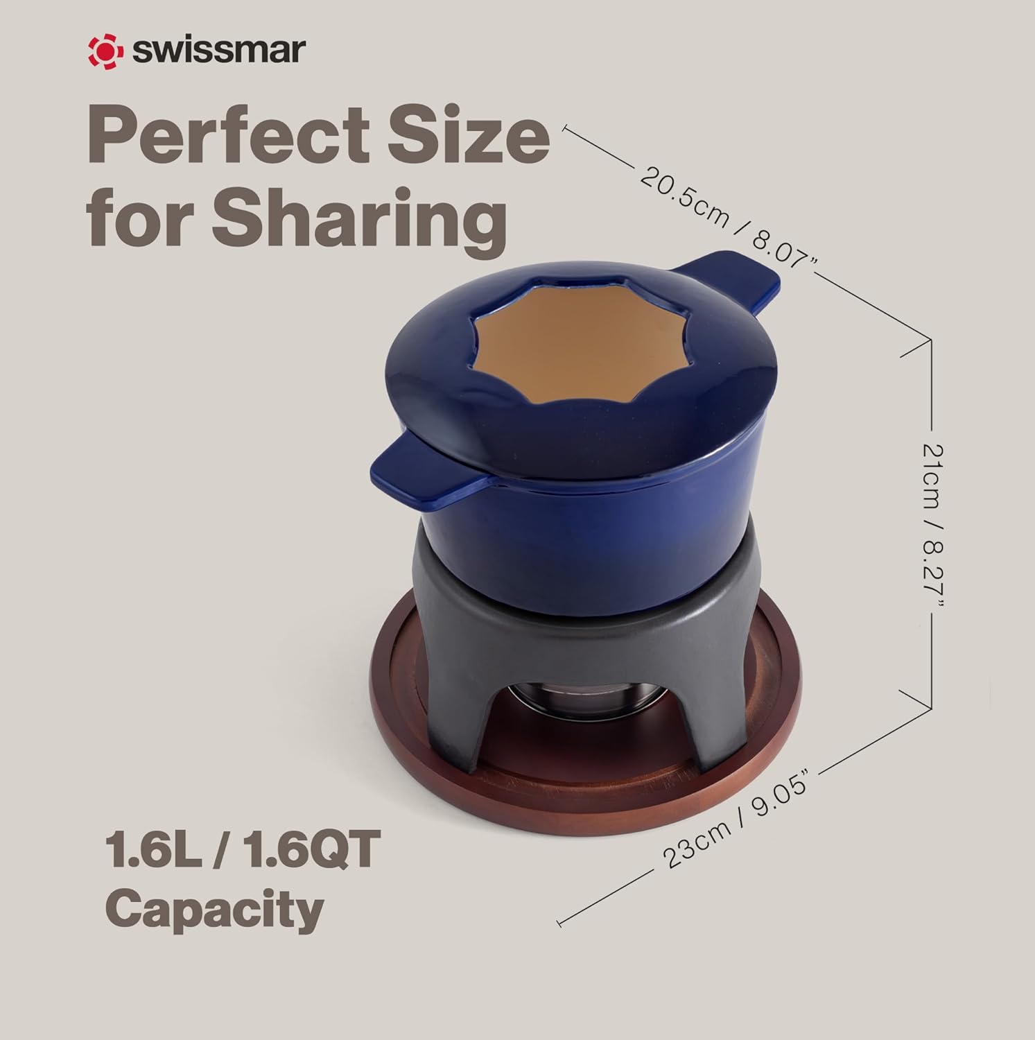Swissmar Sierra Cast Iron Fondue Set, 1.6 Quart / 1.6 Liter – Perfect for Meat, Cheese, & Chocolate Fondues – Ideal for Family Bonding & Hosting Gifts - 12-Pieces, Deep Blue