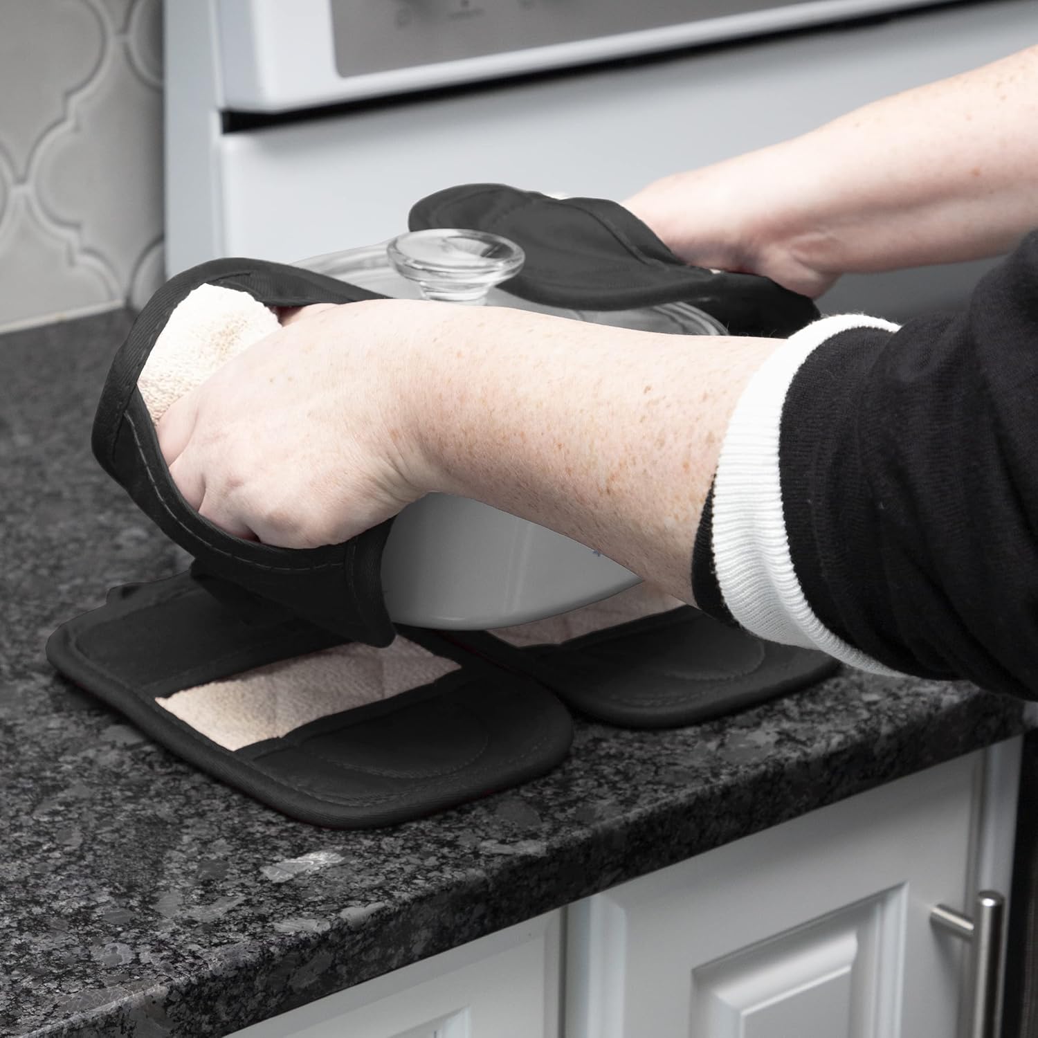 - Versatility. Use as an oven mitt, potholder, and hot pad to protect your hands and kitchen surfaces.