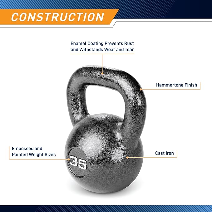 - Kettlebell Sizes: This kettlebell is available in 10, 15, 20, 25, 35, 45, and 55 pounds to allow you to customize your training according to your needs. Each piece of equipment is cast to a precise weight for safe and efficient weightlifting exercises.