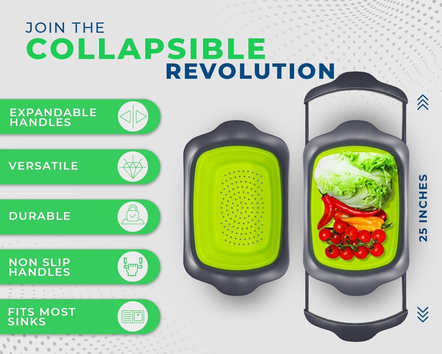 - Large Enough, yet Foldable: The non-slip handles expand to almost 25", and the colander can hold up to 6 Quarts of your favorite food, but the space-saver design makes it easy to fold and store in your already cramped cupboard.