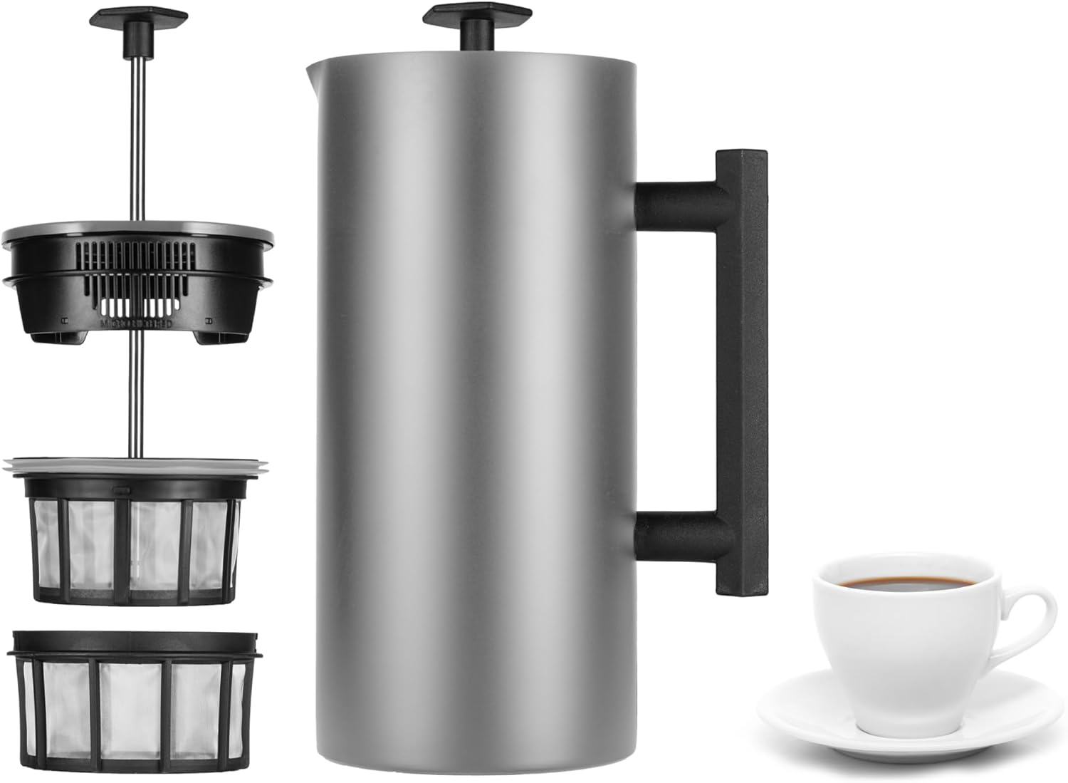 - GRIT AND SLUDGE FREE COFFEE: Our patented double micro-filter ensures every sip of coffee from your french press is smooth and delicious. Say goodbye to unwanted coffee grounds and enjoy grit-free, sludge-free perfection with your coffee press!