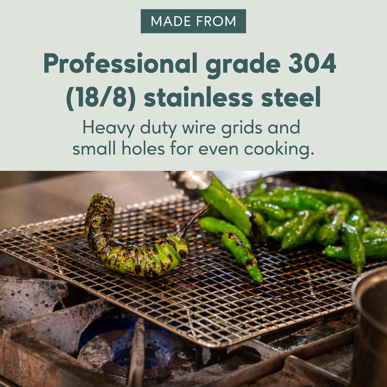 - HEAVY DUTY STAINLESS STEEL, STURDY DESIGN: Small cooling rack for quarter sheet baking pans are food-safe, professional grade 304 (18/8) stainless steel with strong, heavy duty wire grids, small holes, smooth no-snag edges, and a full 1 inch height resulting in greater all around airflow for even cooking, cooling and roasting every time