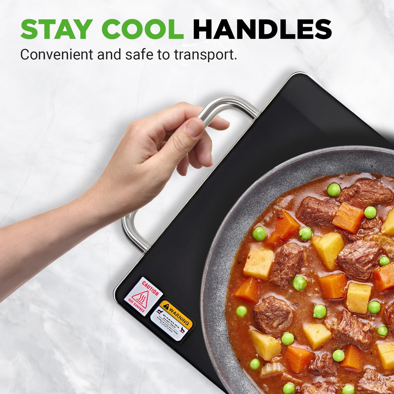 - HASSLE-FREE OPERATION: Press to turn on the power switch, the light indicator comes on which indicates the tray is warming up. Preheat for at least 5 minutes before placing pans on tray. The temperature on the black glass surface is around 95℃