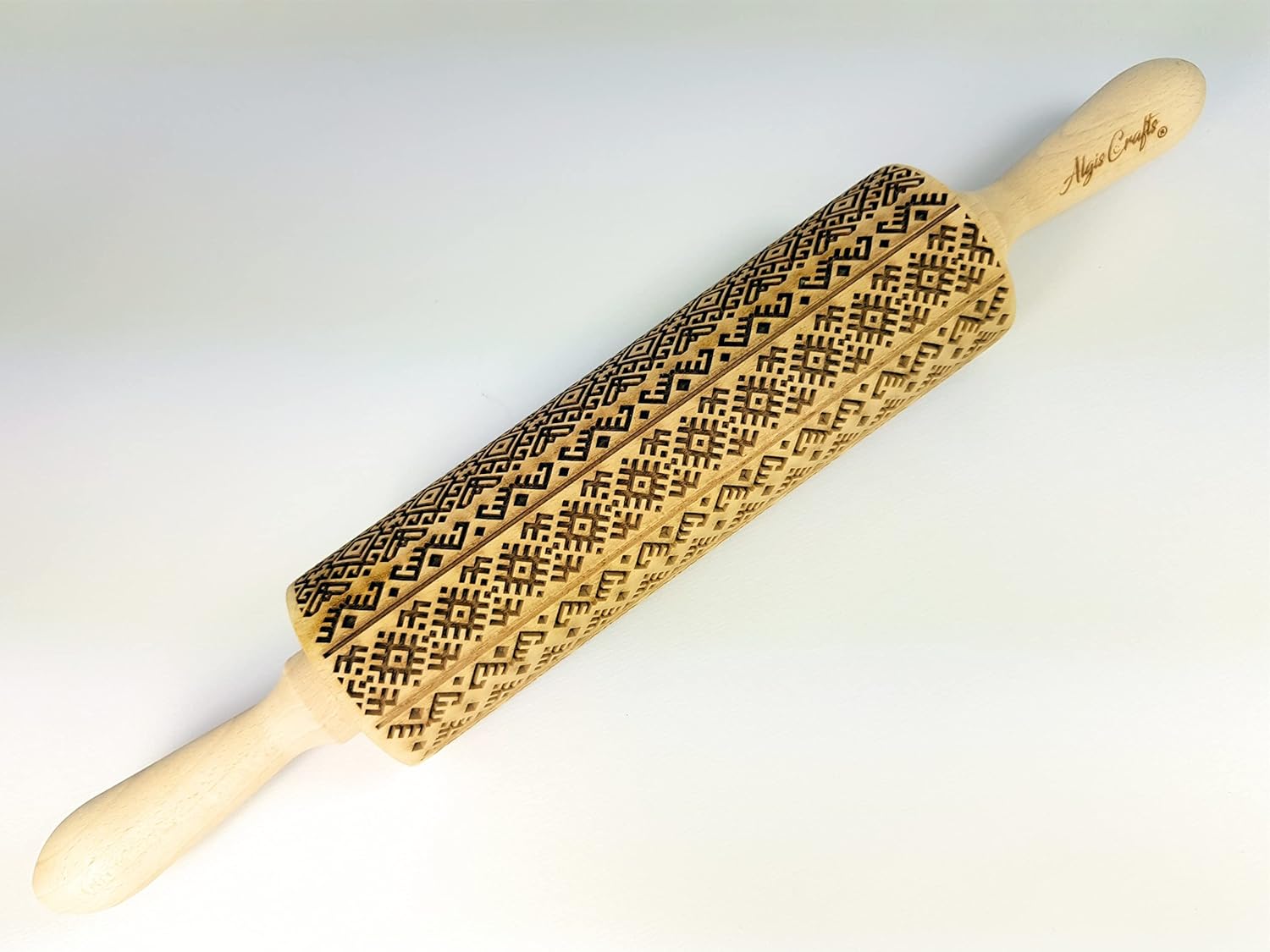 - Constructed out of highly durable Beech wood, this laser-etched rolling pin is optimally sized to roll out dough, with a large 7.9" embossing surface, 2.4" diameter, and 15.8" overall length (with handles).