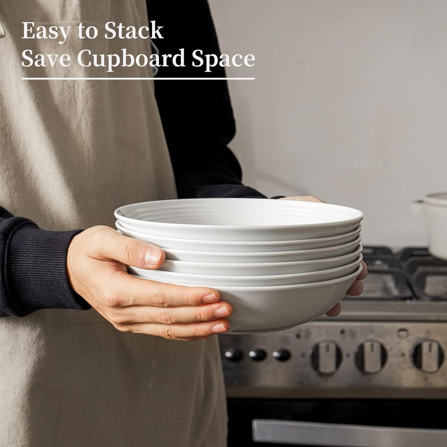 - Stackable & Easy To Clean: These serving bowl sets are easy to stack with a flat bottom design, and all 6 stacked together take up only 3.5" of vertical space. Y YHY insists on using top-grade porcelain, anti-scratch, anti-chip, lead-free, and cadmium-free. These pasta bowls are oven, freezer, dishwasher, and microwave safe. No chips, scratches, or discoloration