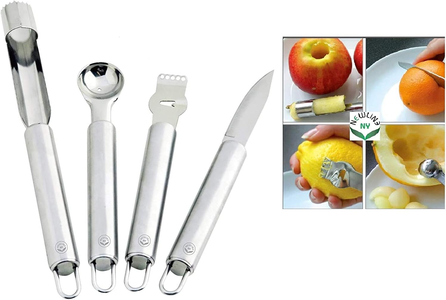 NewlineNY Stainless Steel Kitchen Tools: Zester Grater with Channel Knife, Apple Cupcake Corer, Fruit and Melon Scooper, Fruit & Veggie cutting knife, 4 Pcs Set