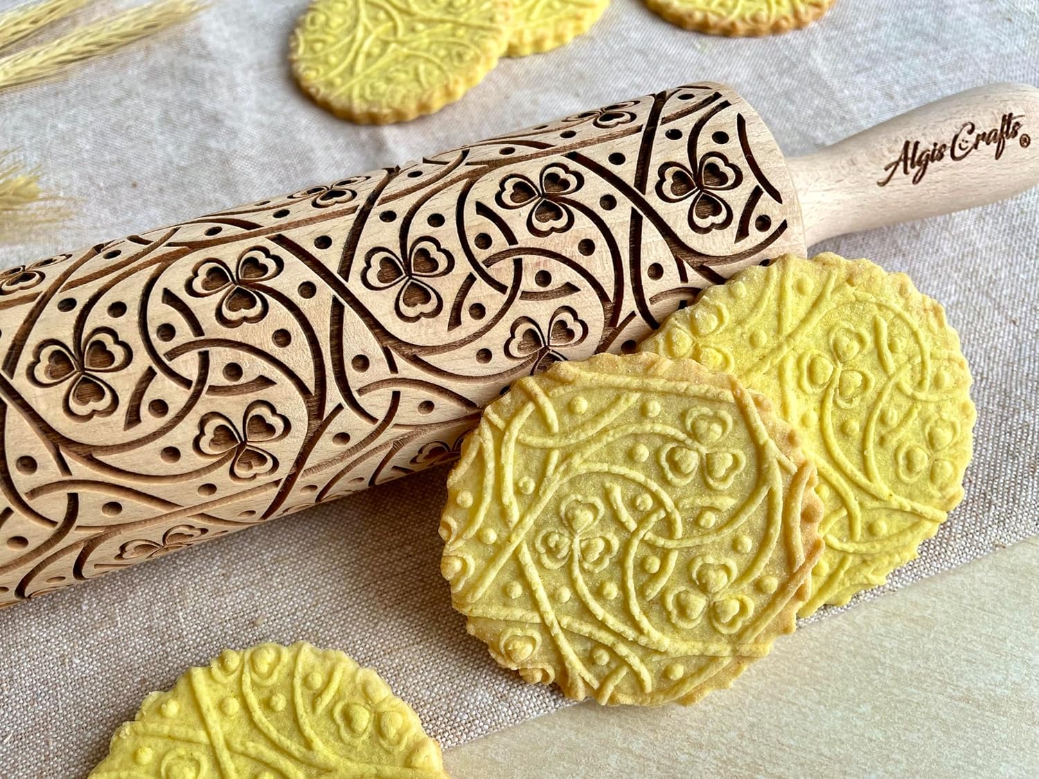 IRISH CLOVER KNOT Embossing Rolling Pin. Dough Roller with Shamrock Pattern for Homemade Cookies and Pottery by Algis Crafts