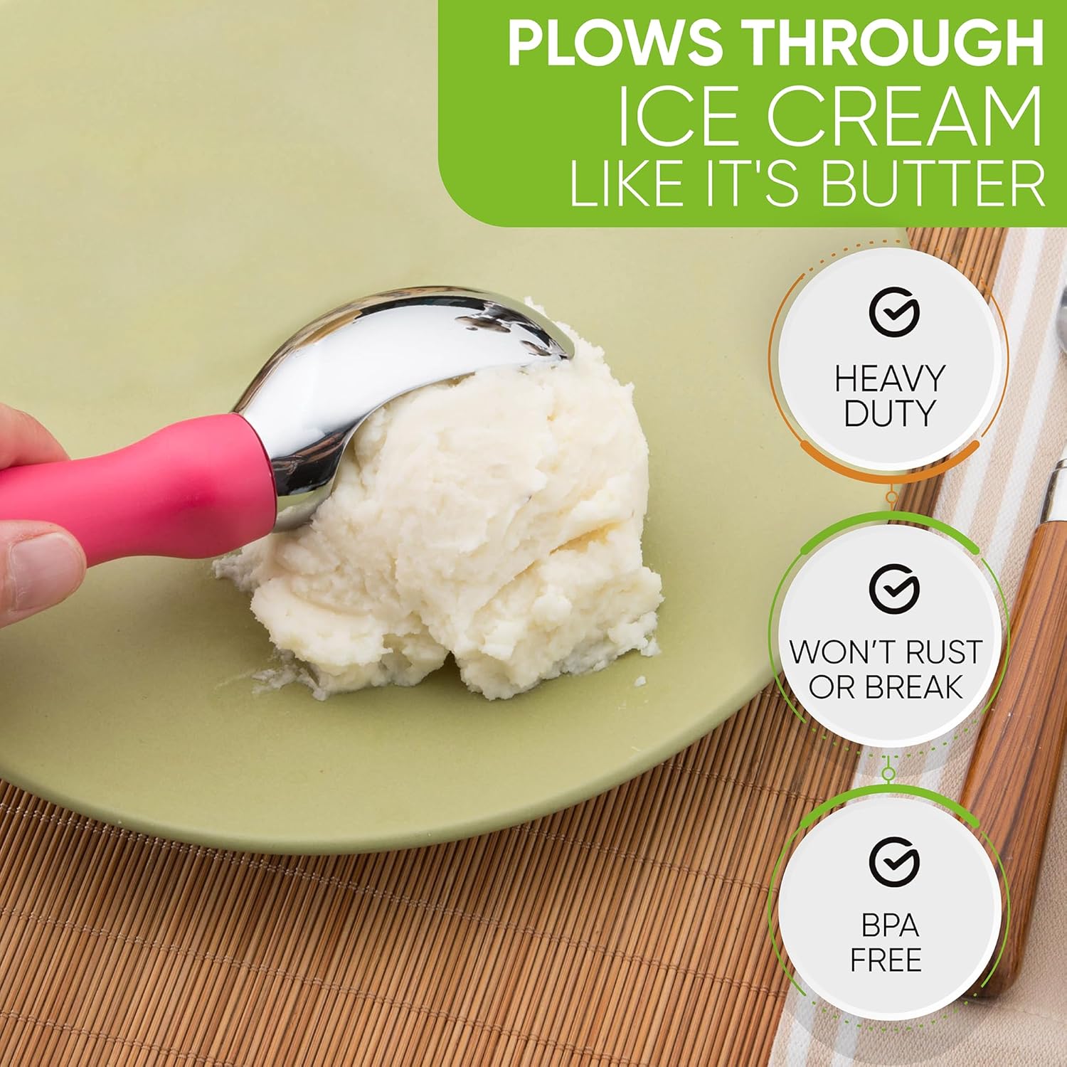 - PLOWS THROUGH ICE CREAM LIKE IT'S BUTTER - Glides smoothly and easily through hard-packed frozen sweets. It will seem like ice cream flows right into the ice cream scoops and drops into your bowl or cone with little to no effort.