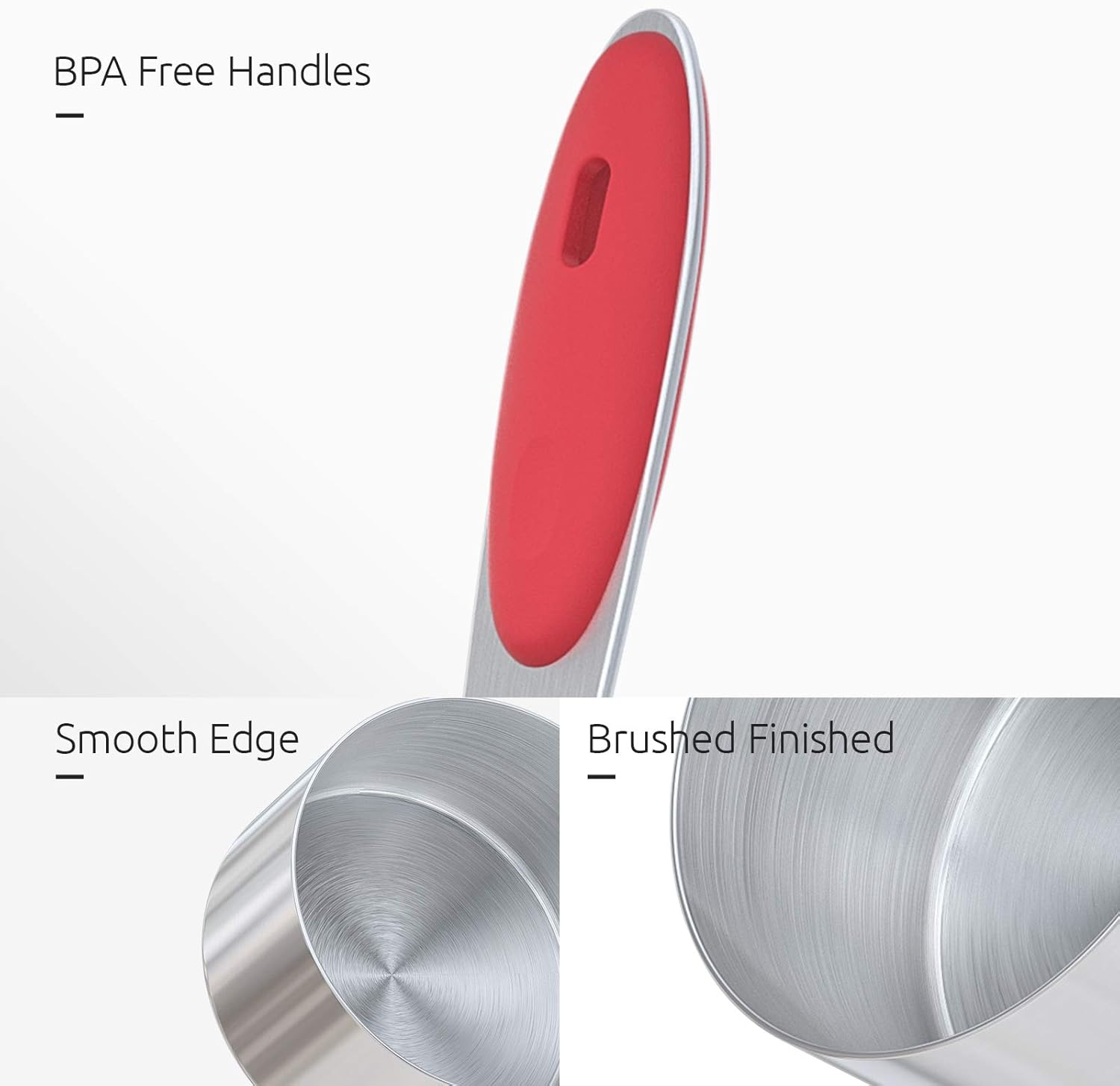 - [Safe cooking with 18/8 food grade stainless steel] If you do mind unsafe plastic or rusty stainless steel touching your food as 10.12% persons display, maybe you should try U-Taste 18/8 stainless steel set. We upgraded the material to rust resistant & Sturdy 18/8 stainless steel and thickened the cup body to avoid cracking. Safe for you to measure both liquid and dry ingredients.