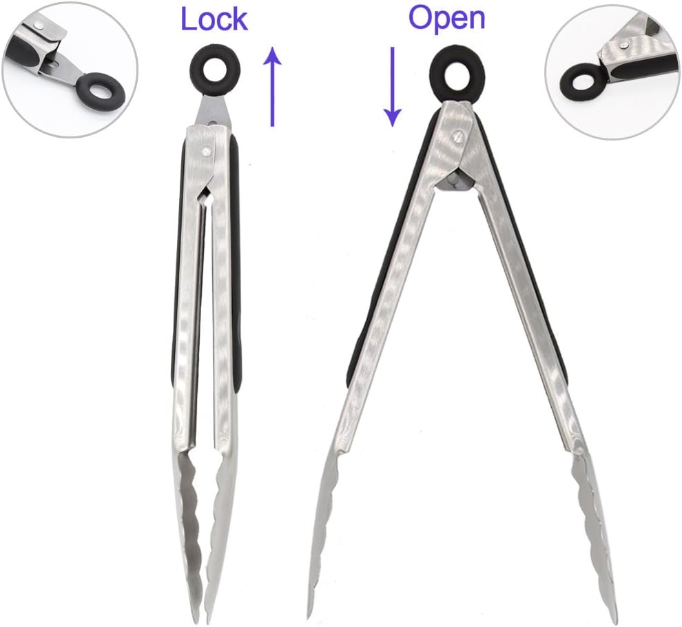 304 Stainless Steel Kitchen Cooking Tongs, 9" and 12" Set of 2 Sturdy Grilling Barbeque Brushed Locking Food Tongs with Ergonomic Grip, Black