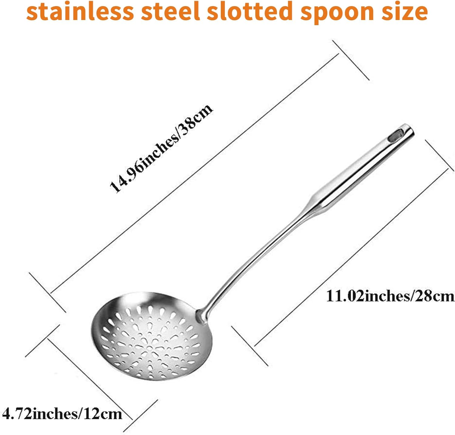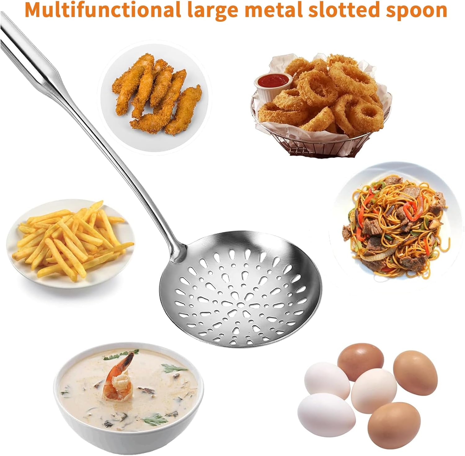 - High Quality Material - Stainless steel ladle made of food grade 304 Stainless Steel. Stainless steel strainer safe, rustproof, durable and will last long. skimmer spoon is excellent kitchen helper, slotted spoons for cooking, colander for kitchen, fryer scoop, perfect holidays, birthday gifts for family, friends or kitchen lovers