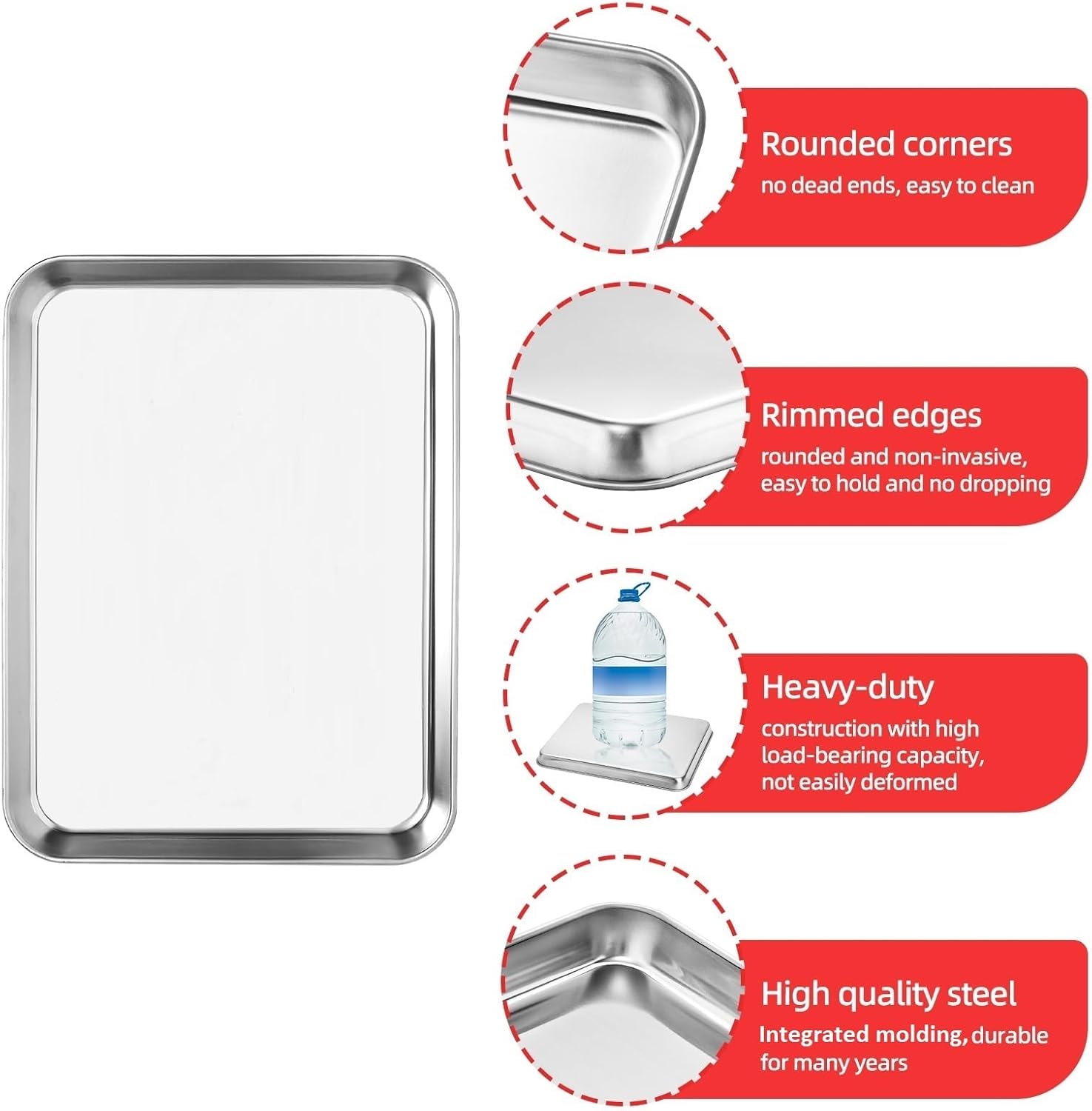 - More Healthier: The baking pan is made of quality food grade pure 18/0 stainless steel without any chemical coating or any other toxic materials. No more aluminum into your food, great replacement to aluminum pan, wouldn't create chemicals at high-temperature baking. Rust resistant and durable for many years.