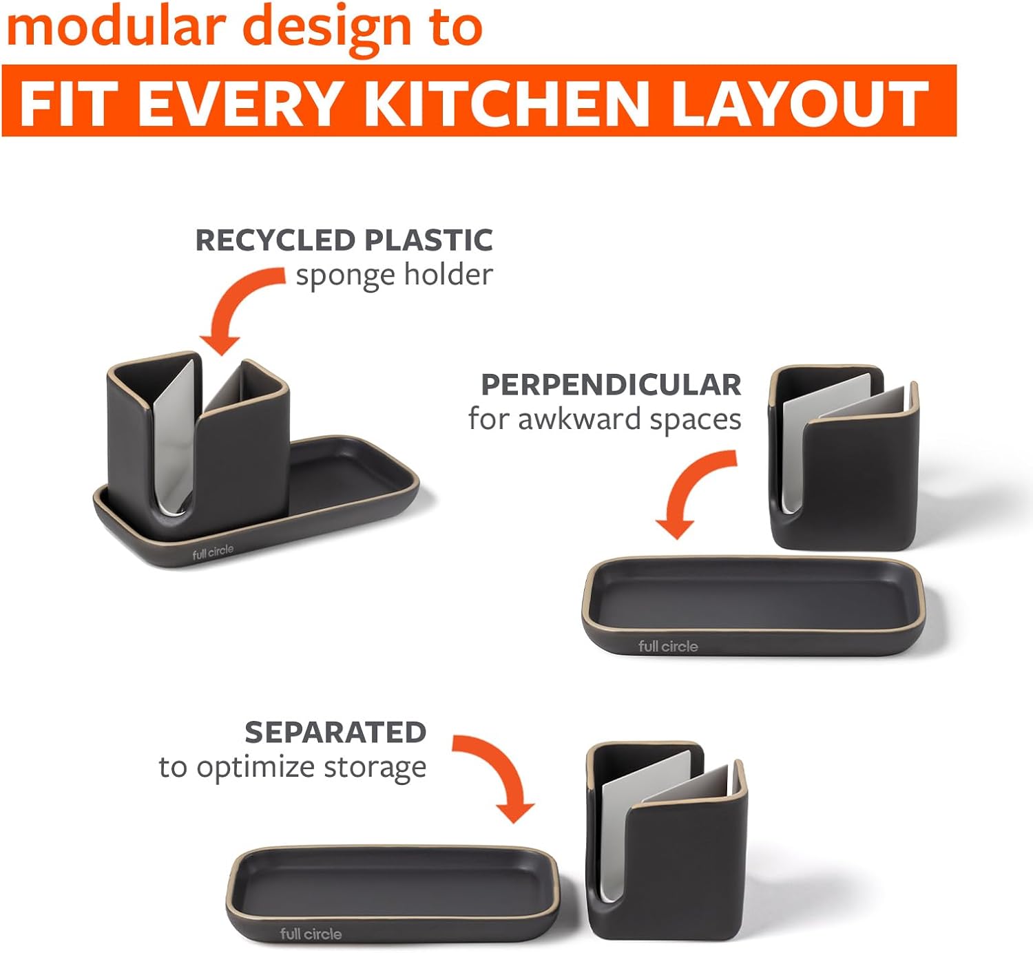 Full Circle Stash, Ceramic Kitchen Sink Caddy, Stylish Modular Sponge Holder & Dish Brush Organizer, Gray and White, 11"