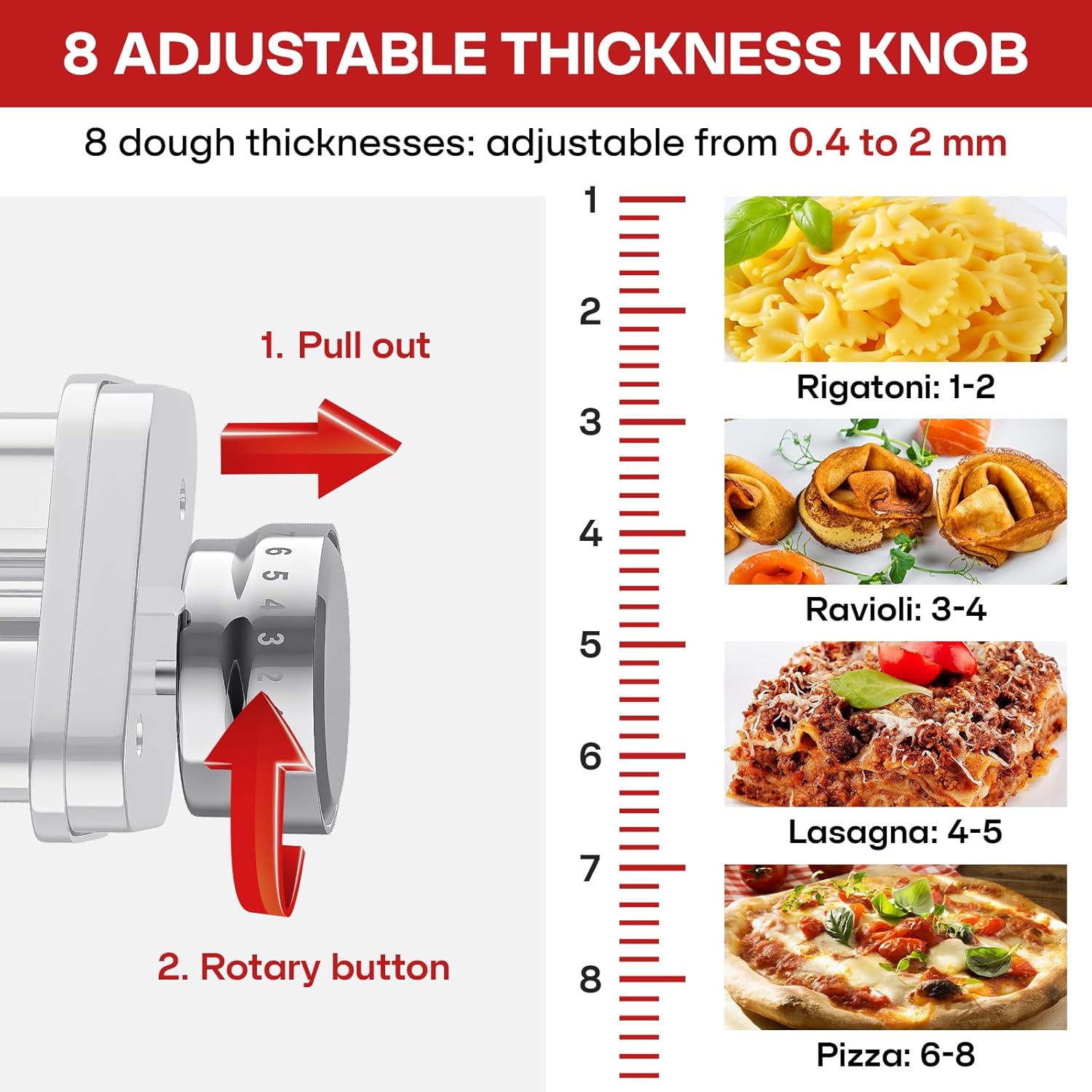 - Pasta roller for Kitchenaid regulating knob with 8 settings allows you to choose the dough sheet thickness, from 0.4 to 2 mm (0.016 to 0.08 in), change the texture and taste of your pasta with this simple adjustment. Make pasta of uniform thickness, great for wontons/dumplings/taco flakes.