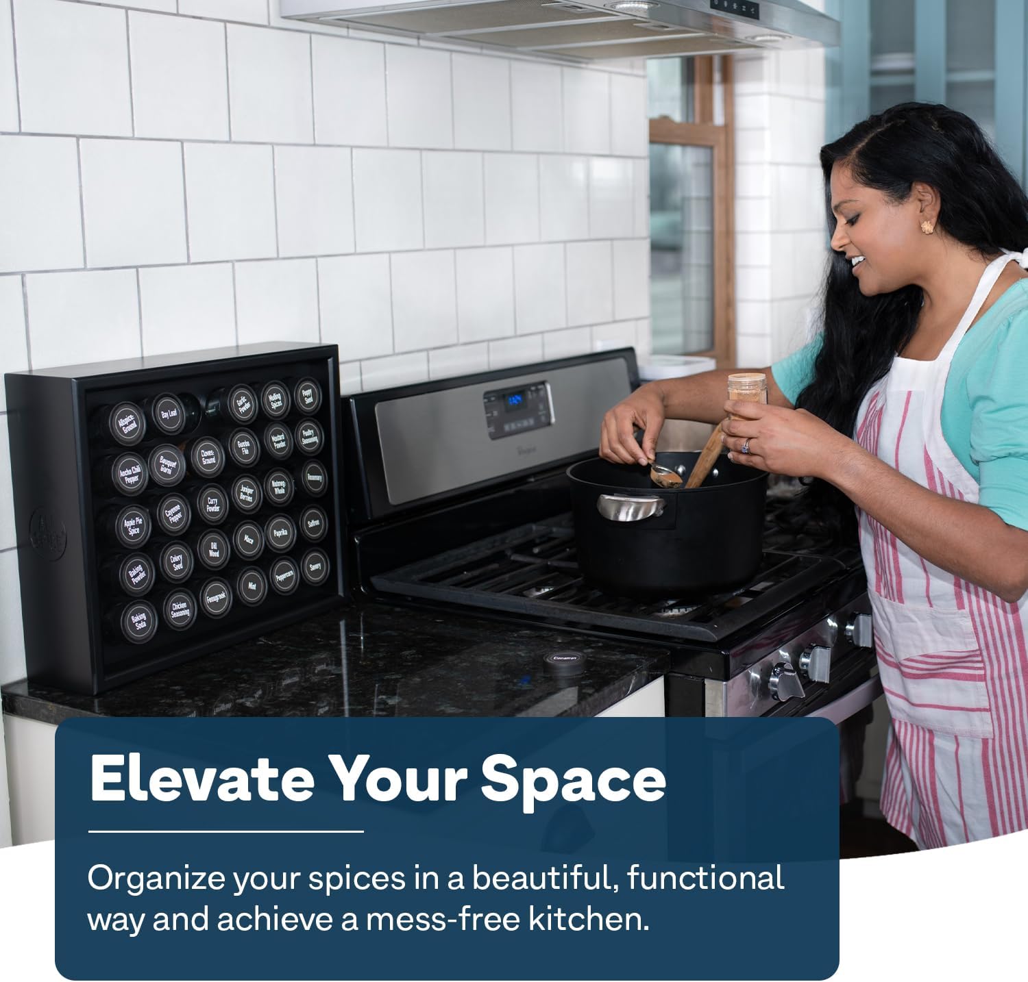 AllSpice Spice Rack Organizer, Wood, 525 Unique Labels, Countertop or Wall Mount, Includes 60 4oz Jars- Matte Black