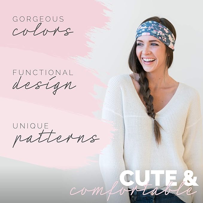 - CUTE DESIGNS: Our headbands come in a variety of cute, modern designs that both girls and women love. Whether you're looking for an accessory to match your favorite sweats or a headband to spruce up your ponytail, we're sure to have a look you'll love. This Energy set features 1 solid pale-pink headband and 1 in a navy floral print.