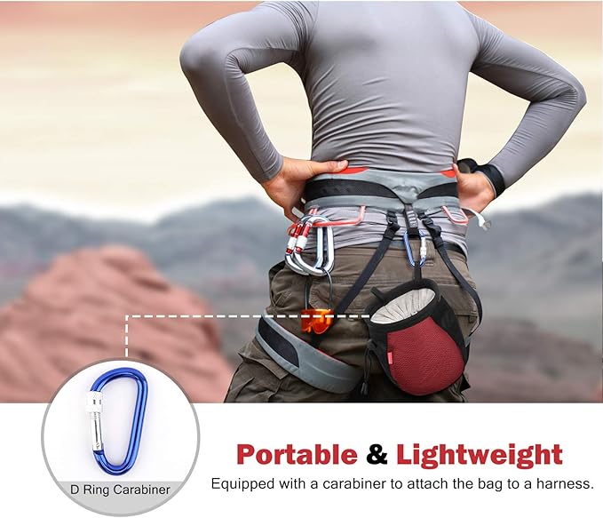- TWO WAYS OF WEARING - The climbing chalk bag Comes with a carabiner for hanging on your own belt or waistcoat; or you can attach it to the waist belt.